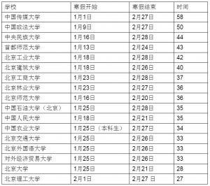 為響應(yīng)教育部號召,部分學(xué)校已經(jīng)實行錯峰放假。例如:北京。對比17所在京高校2021年寒假安排(非全部高校)。其中,中國傳媒大學(xué)寒假時間最長,1月1日開始放寒假,假期長達(dá)58天;北京理工大學(xué)寒假僅27天。