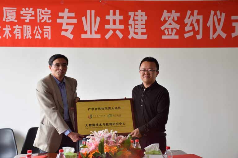 經(jīng)過協(xié)商,雙方達(dá)成一致,根據(jù)各自在專業(yè)領(lǐng)域的優(yōu)勢(shì),開展校企共建專業(yè)合作,簽署了校企共建專業(yè)合作框架協(xié)議,同時(shí)雙方合作成立了“大數(shù)據(jù)技術(shù)與教育研究中心”,并完成授牌儀式。