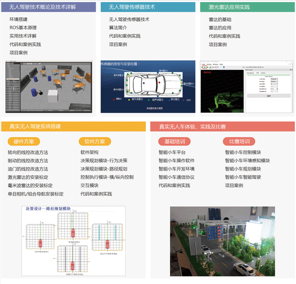 無人駕駛車作為人工智能的主要載體,具有巨大的產業(yè)應用前景。本課程將無人駕駛的基礎和相關技術進行詳細的介紹,并通過實際的無人車平臺開展教學和實踐。 本課程的教學目標是了解無人駕駛汽車中各個模塊的功能,掌握ROS操作系統(tǒng)的在無人駕駛開發(fā)中應用,掌握無人駕駛汽車中控制執(zhí)行模塊的設計,熟悉無人駕駛系統(tǒng)中各種傳感器的工作原理,熟悉16線激光雷達的具體設計開發(fā)方法、學習如何搭建真實無人駕駛系統(tǒng),掌握智能小車的設計方法和開發(fā)流程。