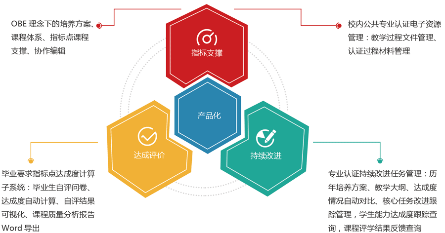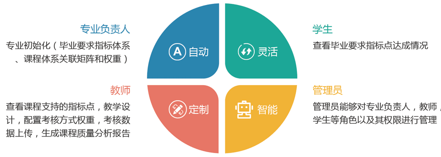 認證寶是以學生為中心、產(chǎn)出導向為指導、持續(xù)改進為方針、解決復雜工程問題為目標,為高校提供工程教育認證的系統(tǒng)化解決方案,全方位智能化支撐工程教育認證需求。